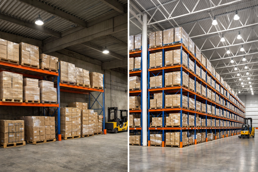Modern warehouses typically provide 10 to 12 metres of clear height, allowing multiple levels of racking and better utilisation of the same floor space.